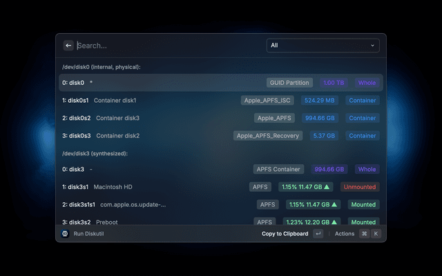 The usage is fairly intuitive. Each disk has multiple actions in Raycast which are self-explanatory and change based on the type and status of the disk/volume. Just try it!