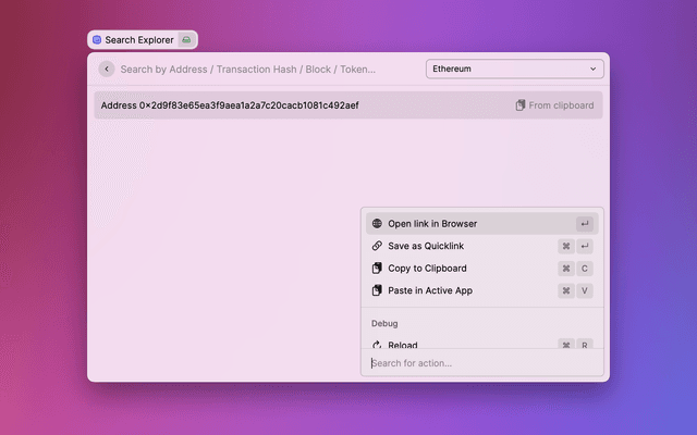 Search and display information found on addresses, transactions, and tokens on blockchain explorers like Etherscan.
