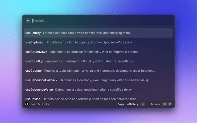 An extension for Raycast to streamline the process of creating custom React hooks.