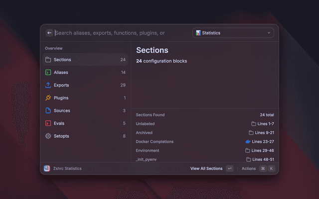 | 📝 | Section Management | View zshrc content organized by logical sections with detailed breakdowns |