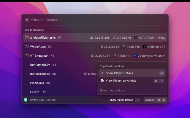 Track Player profiles, Seasonal Leaderboards and Top Creators from Aimlab