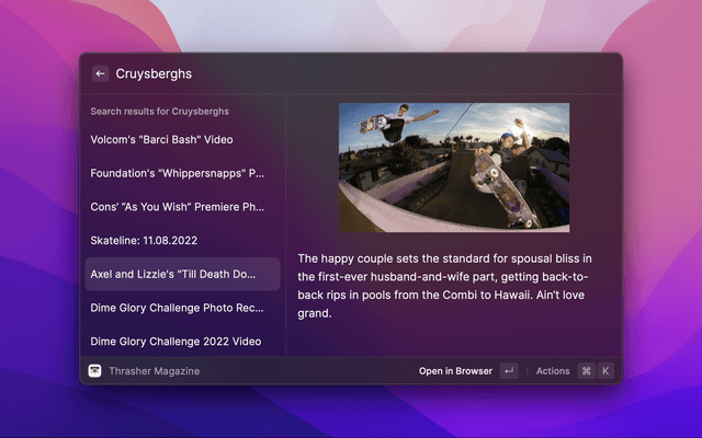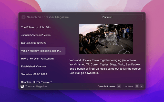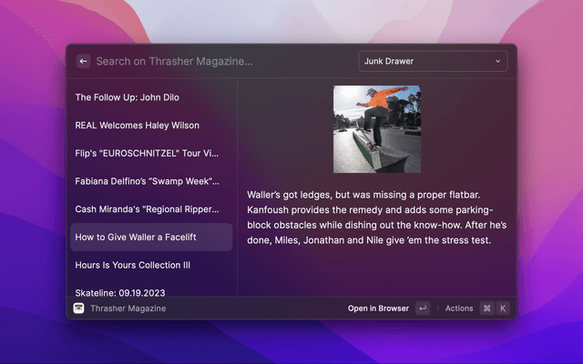 Stay updated with the latest and gnarliest news from the skateboarding world with the Thrasher Magazine News Extension. This extension provides you with easy access to featured and junk drawer news items, and even allows you to search the archives of Thrasher Magazine.