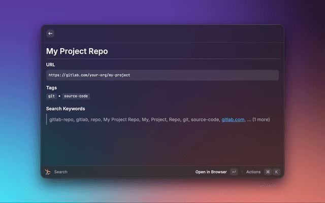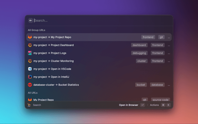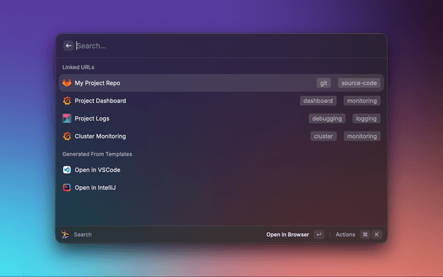 • Powerful Templating: Create dynamic URLs for common patterns (e.g., Kibana logs, Project dashboard, Git Urls) using placeholders.