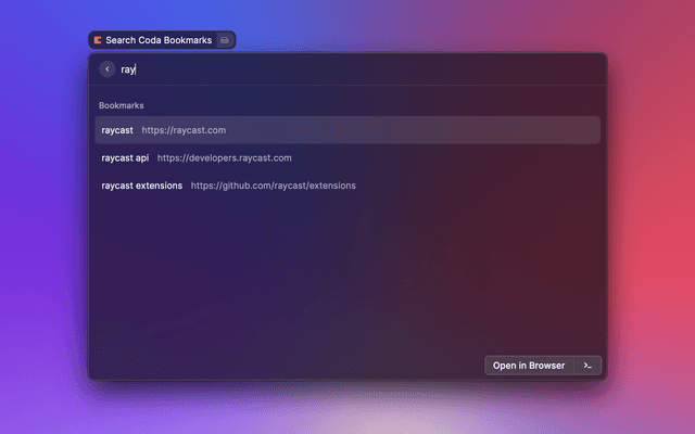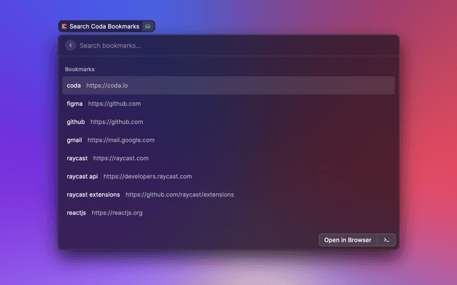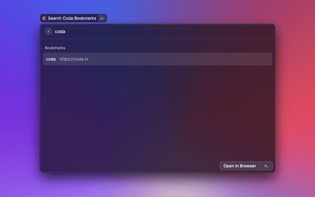 Quickly find and open your bookmarked URLs stored in a coda table.