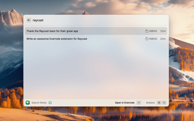 Evernote stores your notes in a SQLite database (Library/Application Support/Evernote/conduit-storage/https%3A%2F%2Fwww.evernote.com). This extension allows you to search for your notes using Raycast.