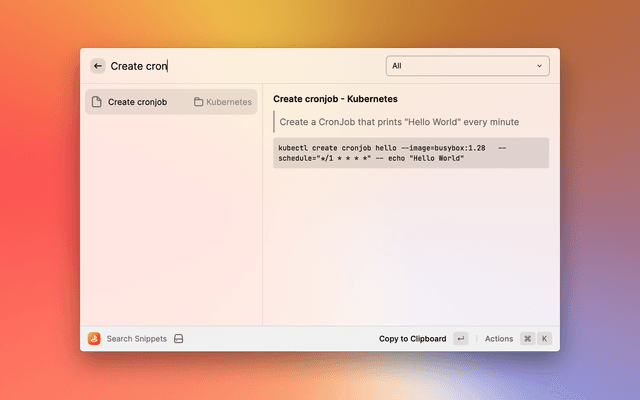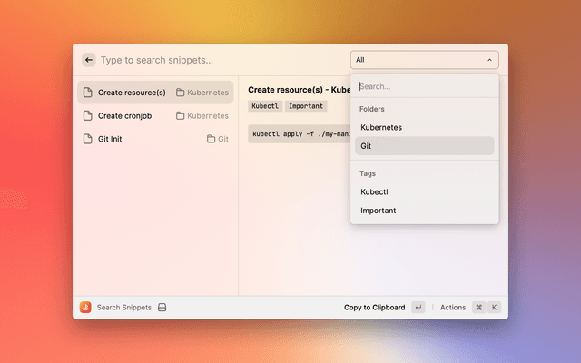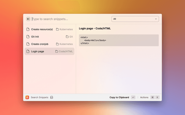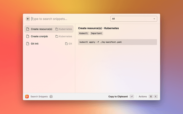 SnippetSurfer is a Raycast extension designed to swiftly navigate through snippets of information. You can effortlessly skim through text excerpts, code snippets, or any other brief segments of content and copy them to the clipboard. The snippets are read from a folder of markdown or yaml files.