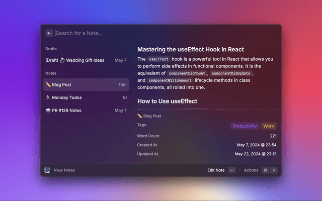 Create simple markdown notes in Raycast stored locally. No integrations required! Allows you to sync with a folder of your choice.