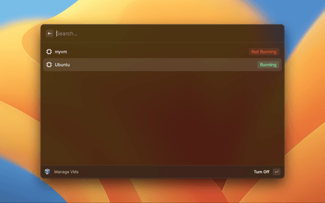 List your VirtualBox VMs, turn them on/off, or delete them.