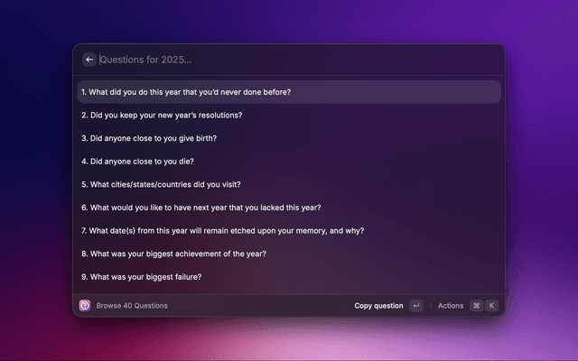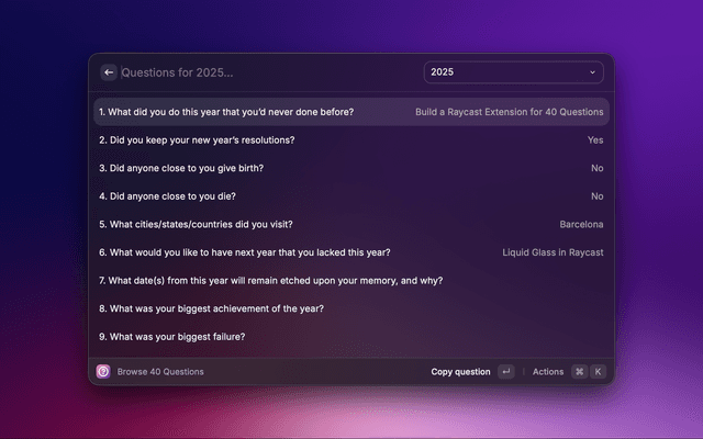 This small Raycast extension surfaces a curated set of 40 reflective questions intended for an end-of-year review. It provides two commands (see package.json):