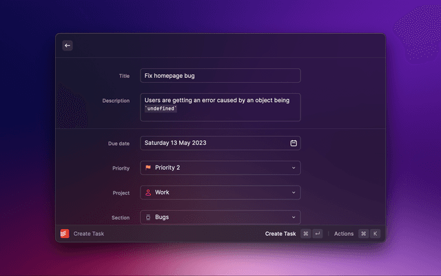 Check your Todoist tasks from within Raycast and quickly create new ones.