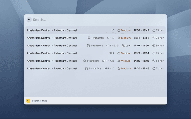 With the Raycast extension for Netherlands Railways, you can easily find train schedules, routes, and real-time updates for the Dutch railway system. This extension simplifies the process of planning your journey by providing quick access to essential information directly from your Raycast interface. Whether you're commuting or traveling, stay informed with the latest train updates and ensure a smooth trip with just a few clicks.