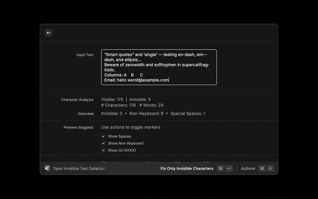 - Fix Invisible Characters: No‑view quick cleaner that operates on selected text or clipboard using your default mode.
