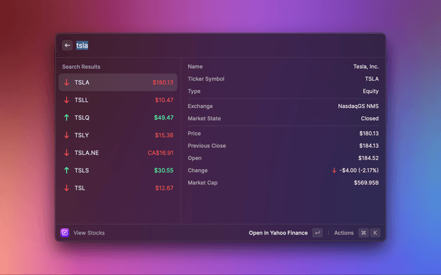 View stock market data in Raycast. Search for individual stocks by name or ticker symbol, and keep track of your portfolio by adding stocks to your list of favorites.