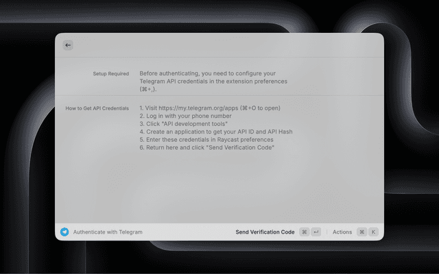 1. Run the "Authenticate with Telegram" command in Raycast