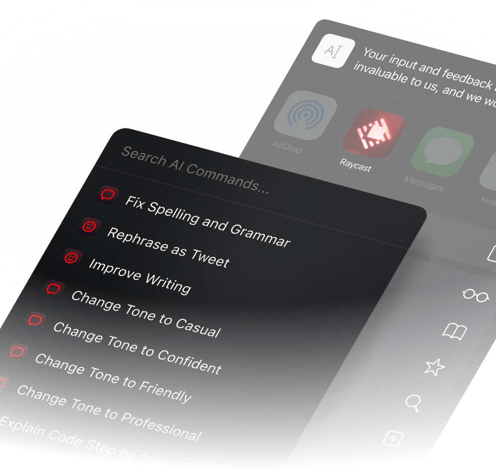 Access Raycast from almost every app. Use AI Commands on selected text.