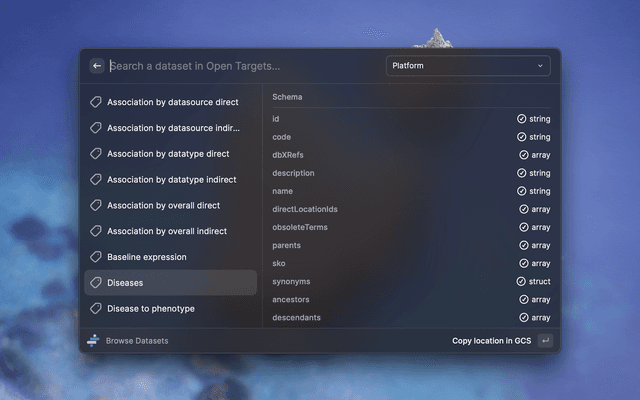 • Browse datasets functionality. Command that allows the look up of the schemas of all the datasets available in Open Targets. Their location in the Google Cloud Storage is copied to the clipboard.