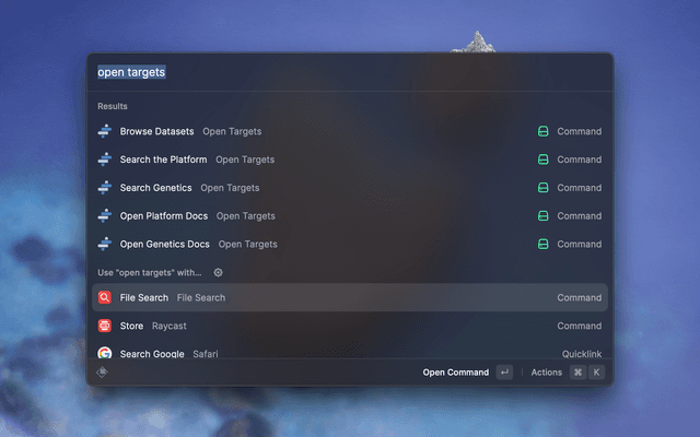 This is an unofficial Raycast extension to facilitate the Open Targets user a convenient entry point to the OT Platform and OT Genetics.