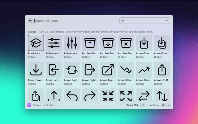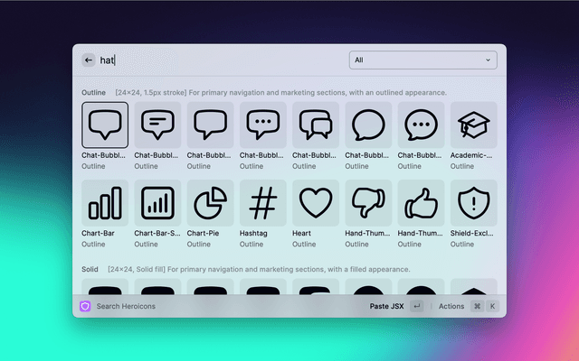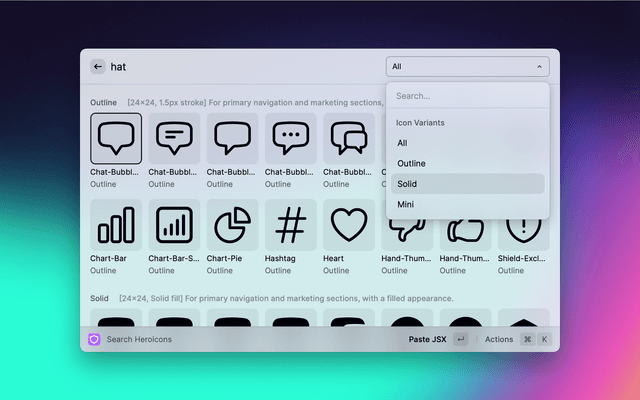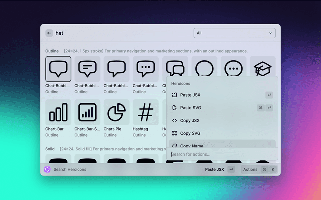 • Copy or paste: SVG, JSX, icon name or even import declaration for React/Vue components