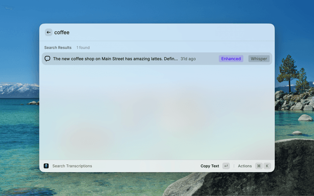• Search Transcriptions: Browse recent transcriptions or search through your entire history with multi-word matching
