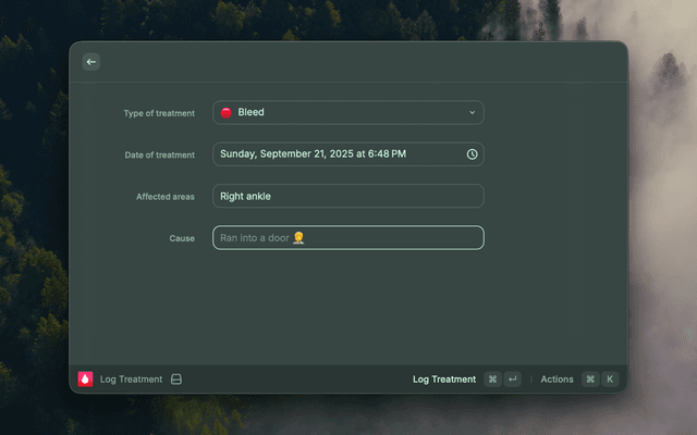 Log a new treatment including the type, date, bleed location, and reason.