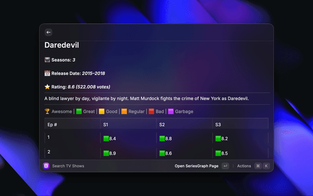 A Raycast extension to search TV shows and visualize episode ratings with graphs.