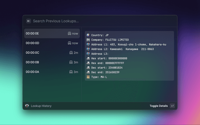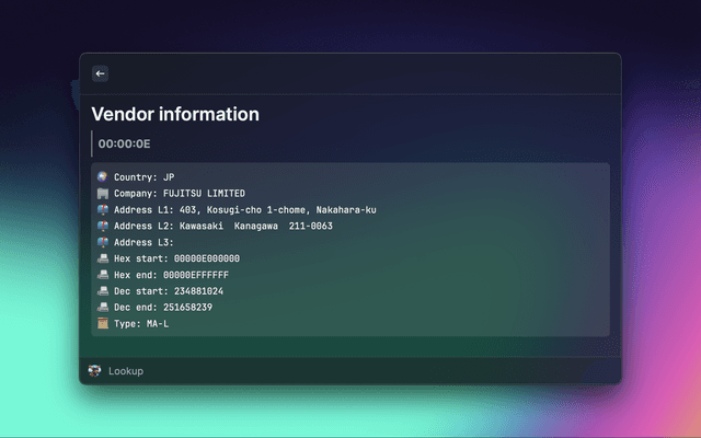 Use www.macvendorlookup.com from Raycast