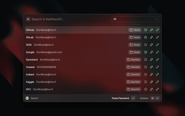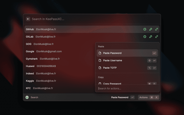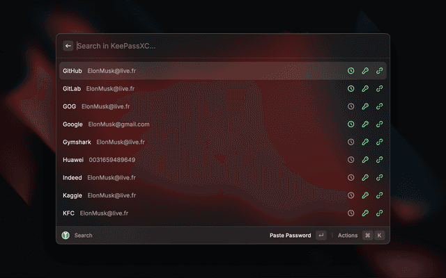Search your passwords, usernames, TOTP codes, and more using KeePassXC directly from Raycast.