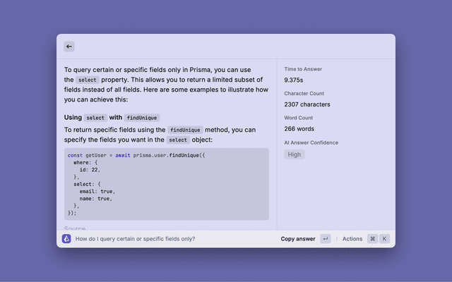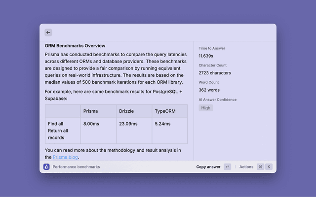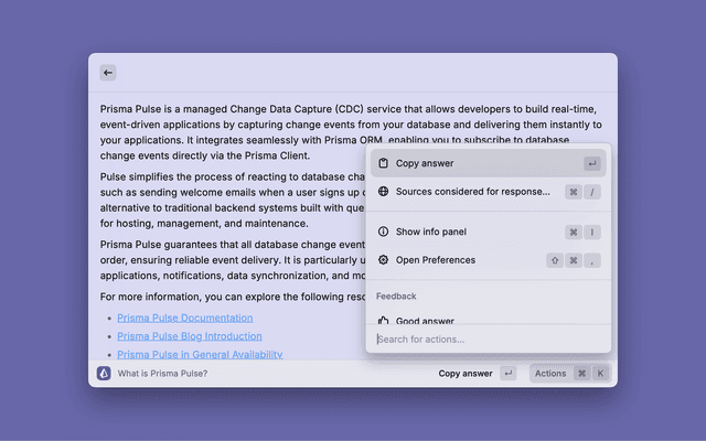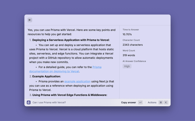 Provides a way for you to use the "Ask AI" feature of Prisma's Documentation from with Raycast. Handy if you are heavy into dev work and want to query the Prisma documentation using a few keystrokes.