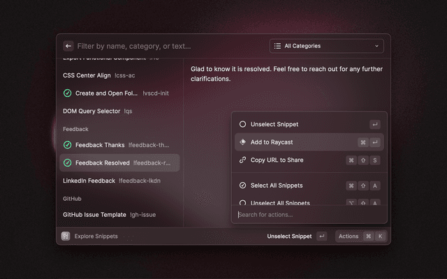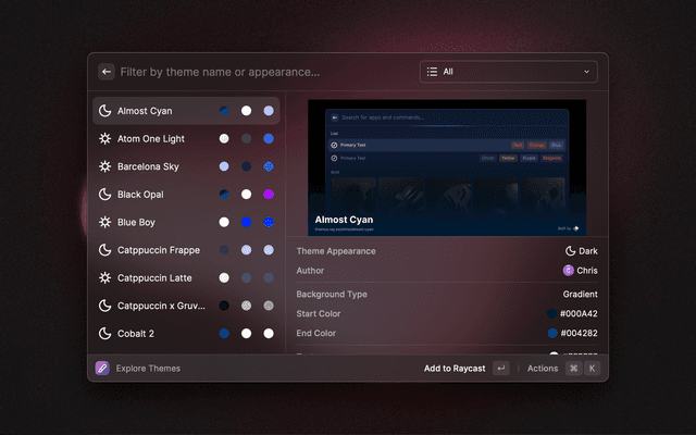 Explore snippets, prompts, and custom themes from within Raycast.