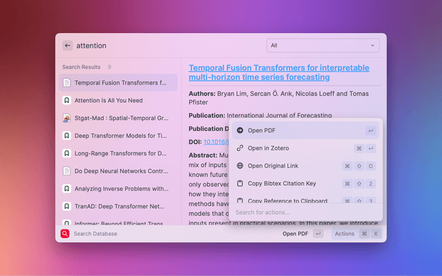 Please note that in case a reference has multiple PDF files associated with it, the primary (oldest) PDF file will be opened, matching Zotero's native behavior.