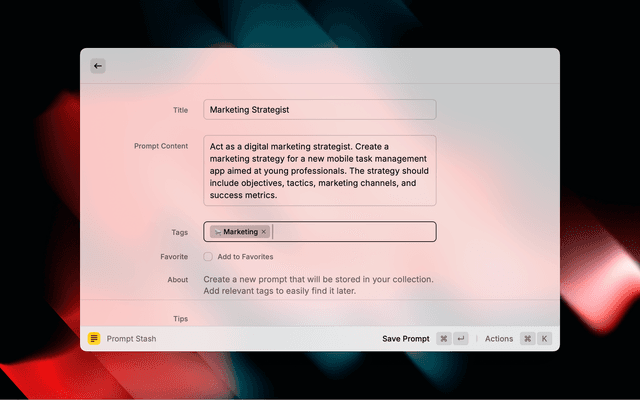 Prompt Stash is a Raycast extension that helps you manage your AI prompts efficiently. Whether you're working with ChatGPT, Claude, or any other LLM, Prompt Stash makes it easy to save, organize, and reuse your most effective prompts.