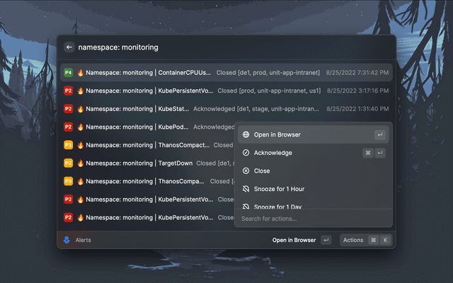 The Opsgenie extension can be used to access alerts and incidents from Opsgenie. The extension can also used to acknowledge, unacknowledge, snooze and close alerts.