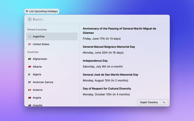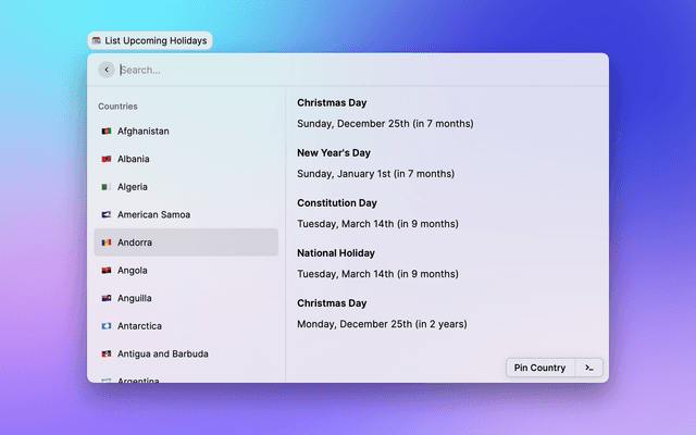 Show upcoming holidays for a country