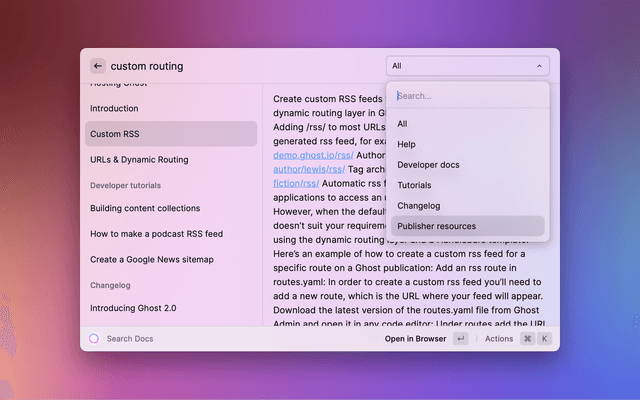 Search Ghost help center, developer docs, tutorials, changelog, and publisher resources right from Raycast!