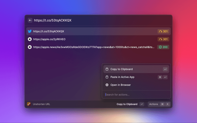- Quick Command: Run the extension through the command menu or by using a keyboard shortcut of your choice, the expanded url gets copied to your clipboard and pasted to your current app.