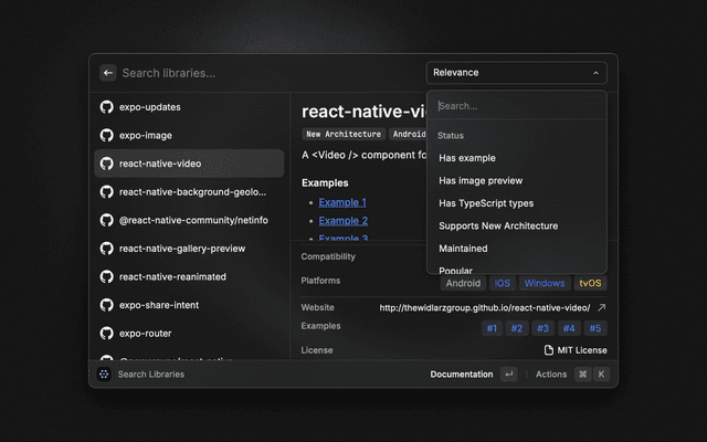 • Status (e.g., Supports New Architecture, Has examples, Has TypeScript types)