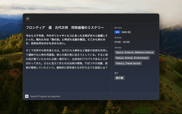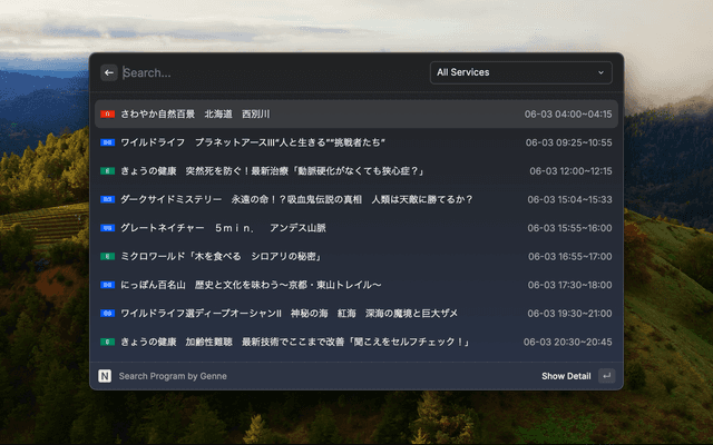 This Extension uses the API provided by NHK. API Key is required to use this Extension. https://api-portal.nhk.or.jp/service-guide