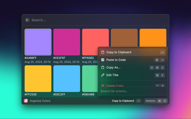 Raycast's Color Picker doesn't rely on complex commands - it's all about simplicity and speed. The primary commands are: