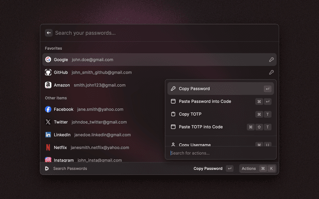 🔎   Search your vault   📋   Copy and paste fields   🔑   Generate TOTP codes   ⭐   Mark items as favorites