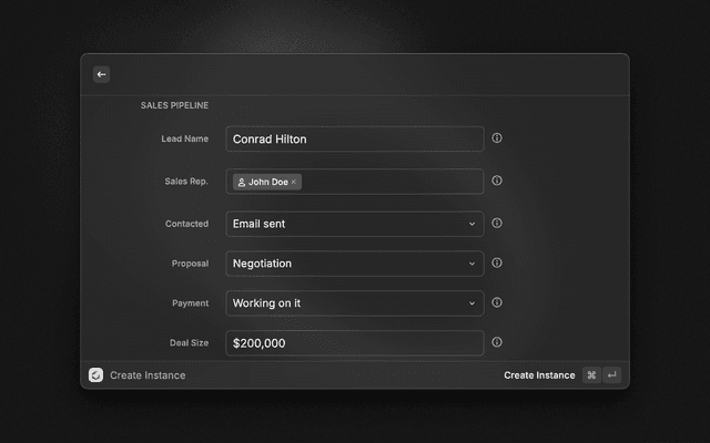 - Create Instance: Create a new instance with custom field values