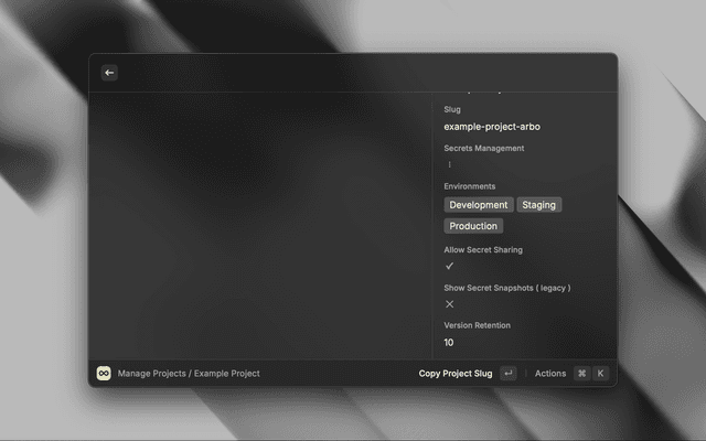 • You can copy or save all secrets of an environment in .env format (change the environment using the dropdown). The file is saved in the "Downloads" folder (if the environment is not "production", the environment is appended to the extension e.g. .env.dev)