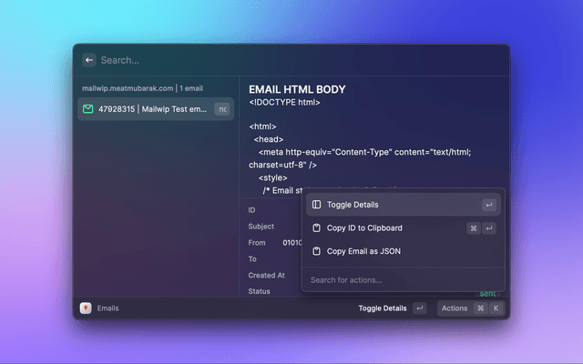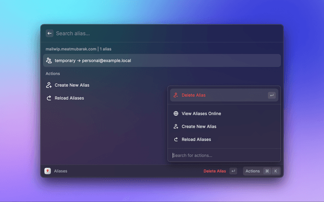 This is a Raycast extension for Mailwip (previously known as Hanami). With this extension, you can Delete Domains, Manage Aliases, and View MailLog in Mailwip.