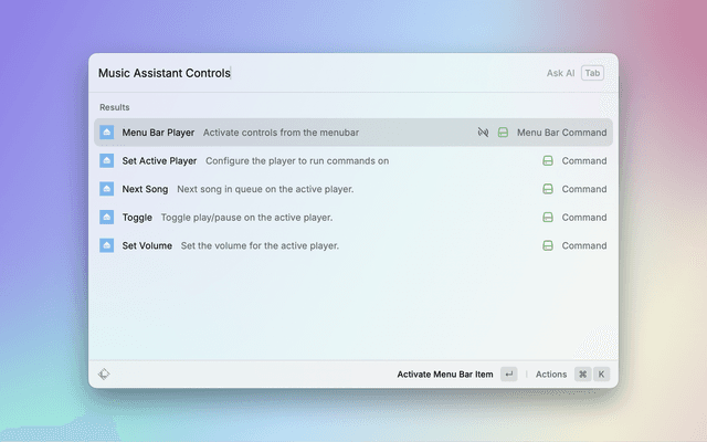 Control Music Assistant from anywhere, and keep the current track in your Raycast menu bar.